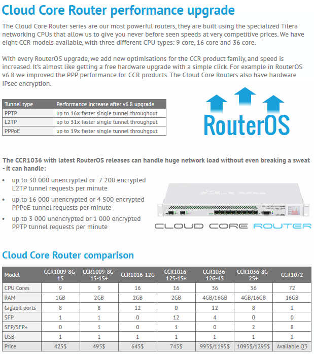 CCR1036-8G-2S+ е един от най-производителните рутери предлагани от Микротик. С 36 ядрен процесор Tilera, 4GB RAM и 10G оптична свързаност, устройството предлага безпрецедентна мощ и ненадмината производителност.