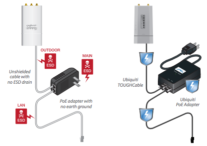 TOUGHCable Connectors Specifi cally designed for use with Ubiquiti TOUGHCables and available in 100-pc. bags, TOUGHCable Connectors protect against ESD attacks and Ethernet hardware damage, while allowing rapid fi eld deployment without soldering. ESD attacks are the leading cause for device failures. The diagram below illustrates the areas vulnerable to ESD attacks in a network. By using a grounded Ubiquiti Power over Ethernet (PoE) Adapter along with Ubiquiti TOUGHCable and TOUGHCable Connectors, you can effectively protect against ESD attacks.