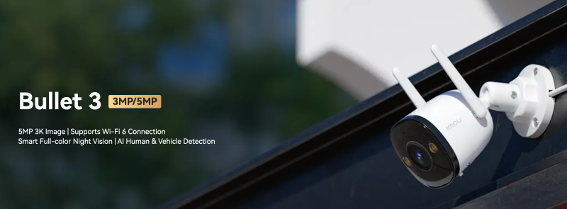 The Imou Bullet 3 - 5MP (IPC-S3EP-5M0WE) is an outdoor Wi-Fi IP security camera featuring a high-resolution 5 MP (2880×1620) image sensor. It supports Wi-Fi 6 and Ethernet connectivity, offers up to 30 m night vision, and provides motion, human, and vehicle detection with instant alerts via the Imou Life aapp. The camera includes a built-in microphone and speaker, a 110 dB siren, and an integrated spotlight for active deterrence. It supports microSD recording up to 256 GB and features a durable IP67 weatherproof design suitable for outdoor installation.